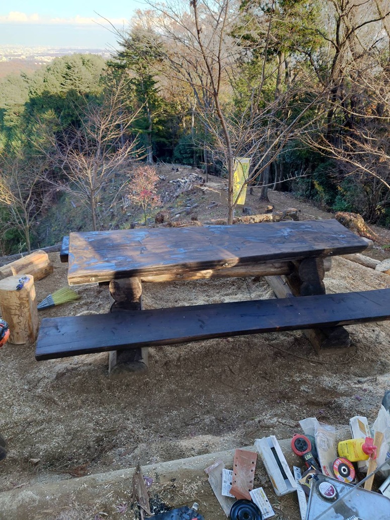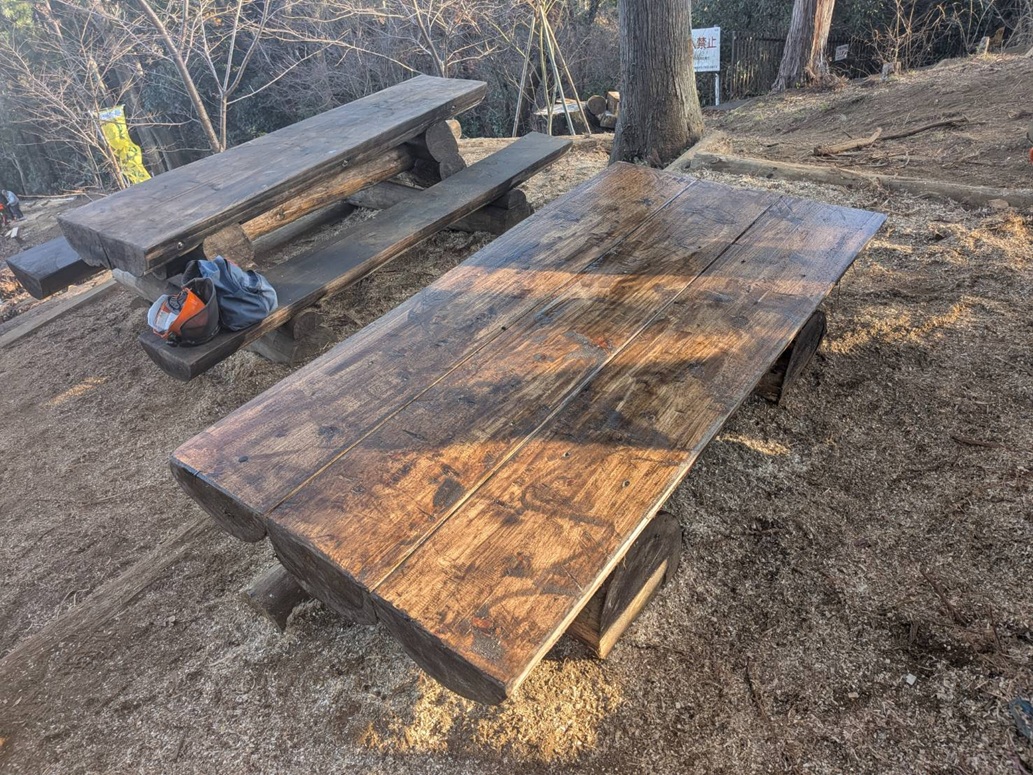 草戸山山頂jに間伐材を使用してテーブル、ベンチ、縁台を設置しました。